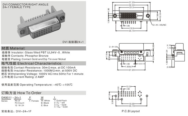 产品型号:24+1 DVI CONNECTOR RIGHT ANGLE24+1 FEMALE TYPE